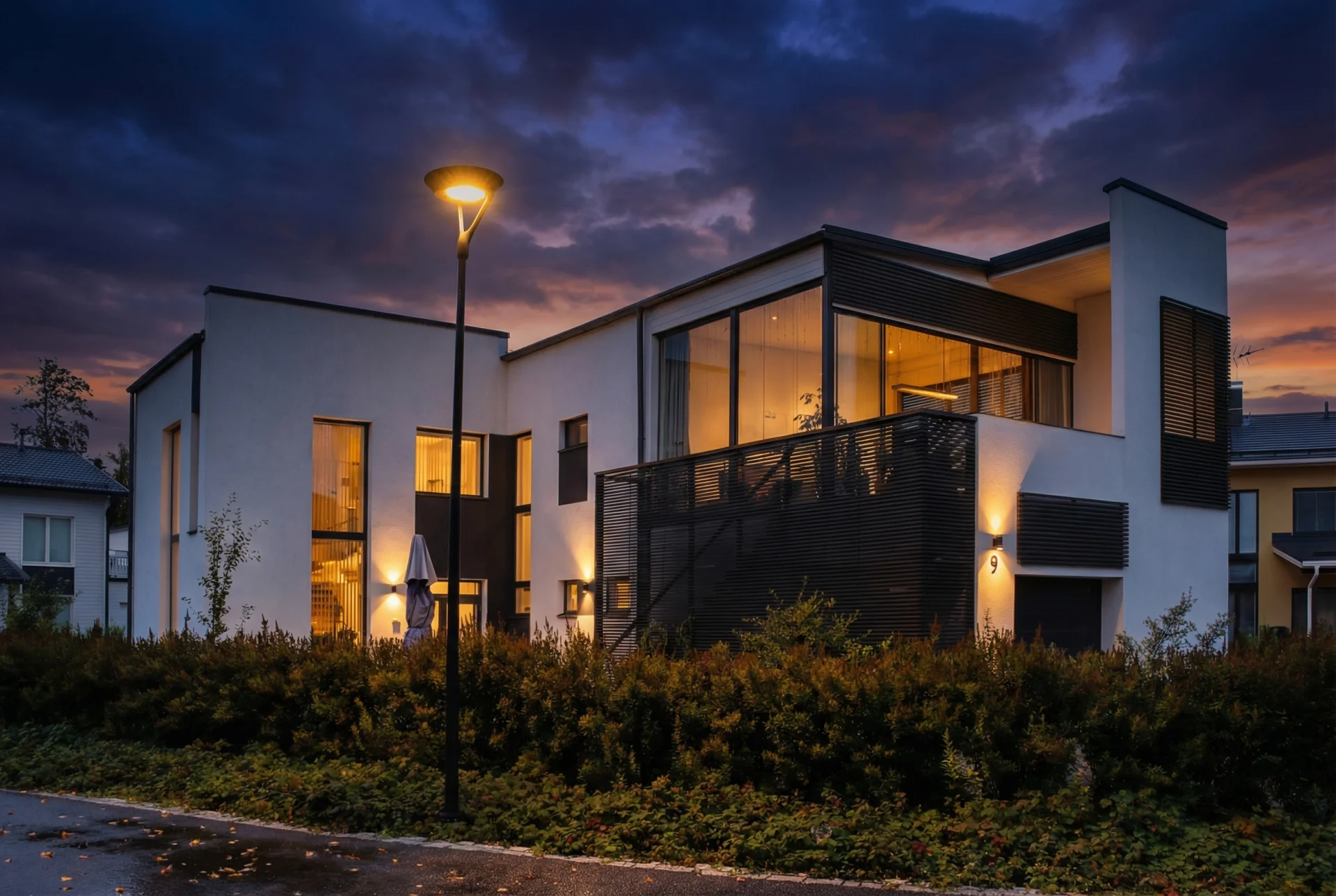Tämä omakotitalo suunniteltiin Vantaan Asuntomessuille urakoitsijalle. Rakentamisen aikana se räätälöitiin talon ostaneen perheen tarpeisiin. Melko pienelle tontille sijoitettiin tilava lasitettu parveke autotallin yläpuolelle lisäämään ulkotiloja.