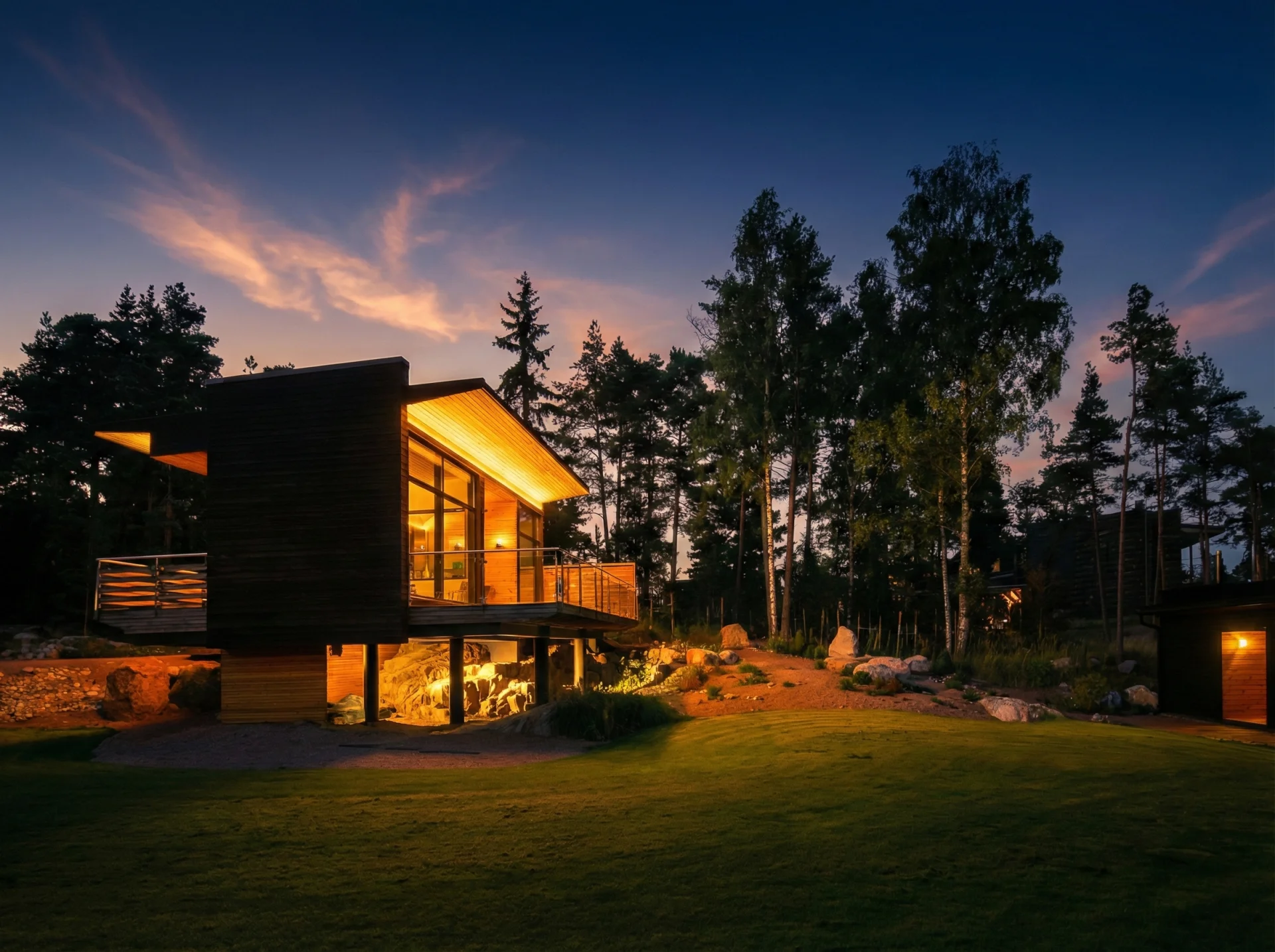 Tämä "leijuva huvila" suunniteltiin vierastaloksi Porkkalan niemimaalle. Kauniiden merinäkymien hyödyntäminen ja julkisivuvalaistuksen integrointi olivat suuri osa tätä suunnitelmaa. Huvilasta on näkymä erilliseen saunarakennukseen merenrannalla.